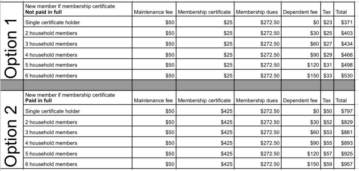 This limited time only, New Membership Option requires the payment of annual membership dues, any applicable dependent fee, and the purchase of a Membership Certificate that is your partial ownership in the swim club. The Membership Certificate payment can be paid in full or spread over 5 years ($25 due in year 1, and $100 due annually in years 2 -5). There is also a $50 maintenance fee that is collected during registration.